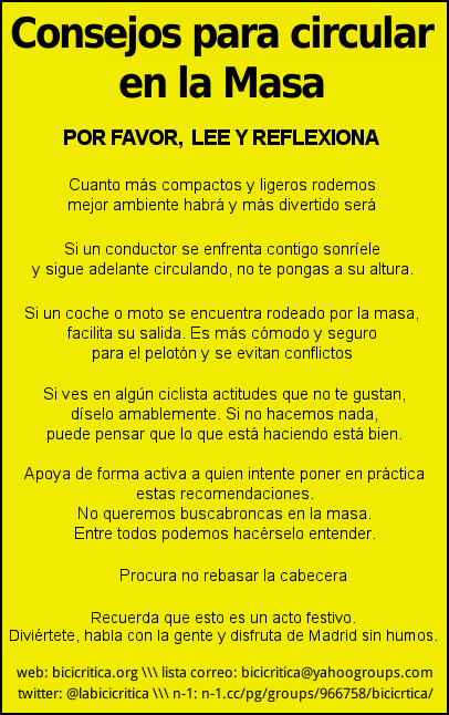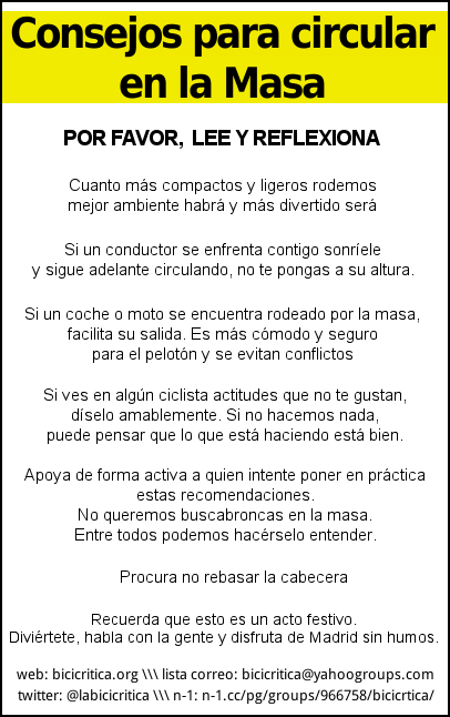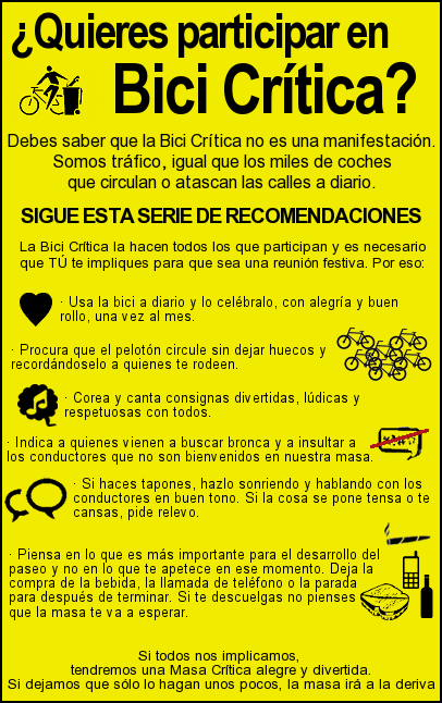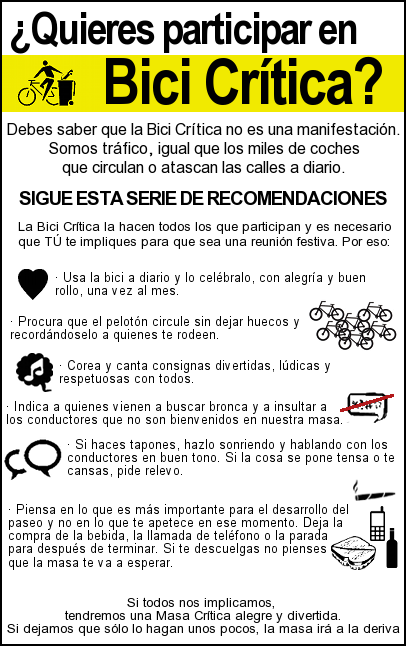 Compartimos los volantes u octavillas que recogen el texto publicado el otro día sobre la Bici Crítica y que, pensamos, debería ayudar a centrar de nuevo el paseo de todos los meses. Se agradece su difusión en internet y también manual. Ayúdanos a mejorar la Bici Crítica.
